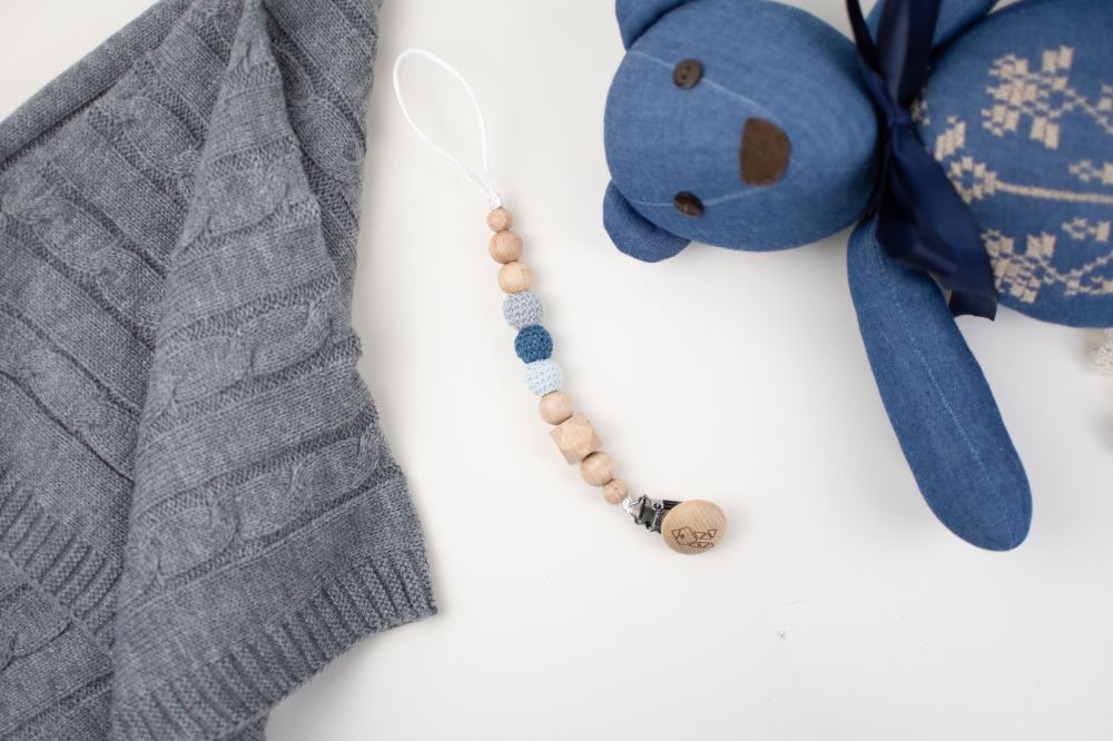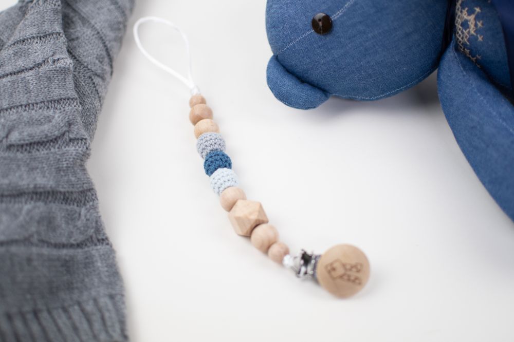 clip porta chupon con distintas texturas y figuras (silicon libre de bpa y madera tratada con aceite de resino) que favorecen a la integracion sensorial. Color rosa beige