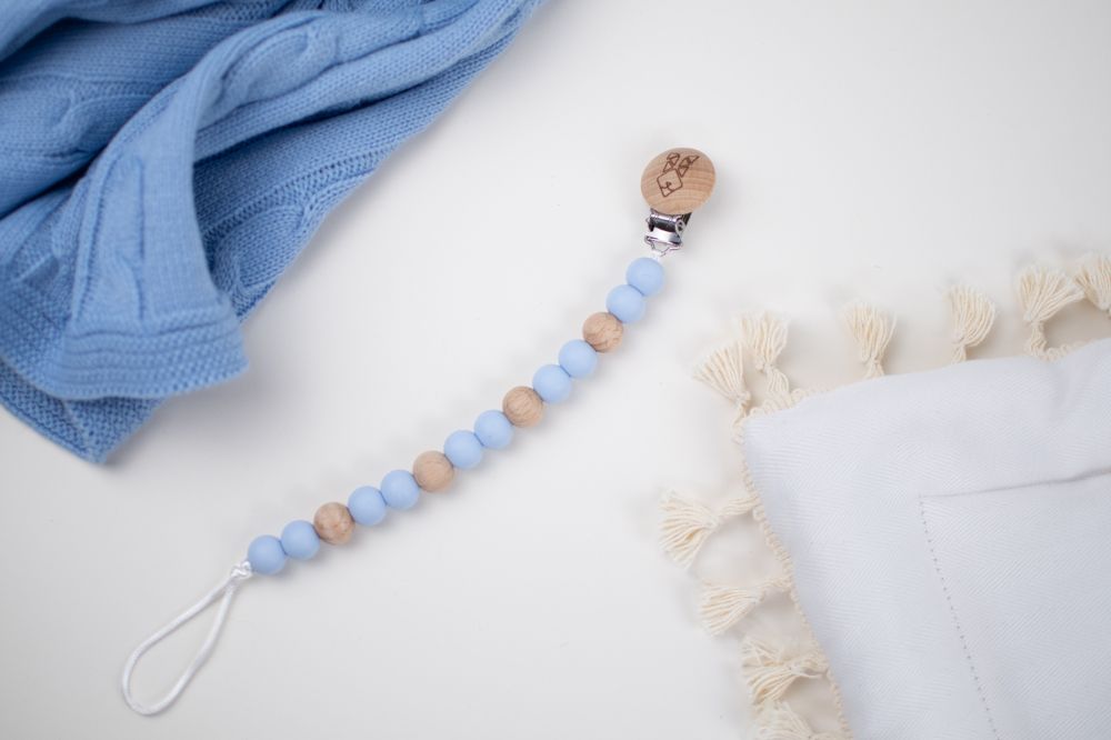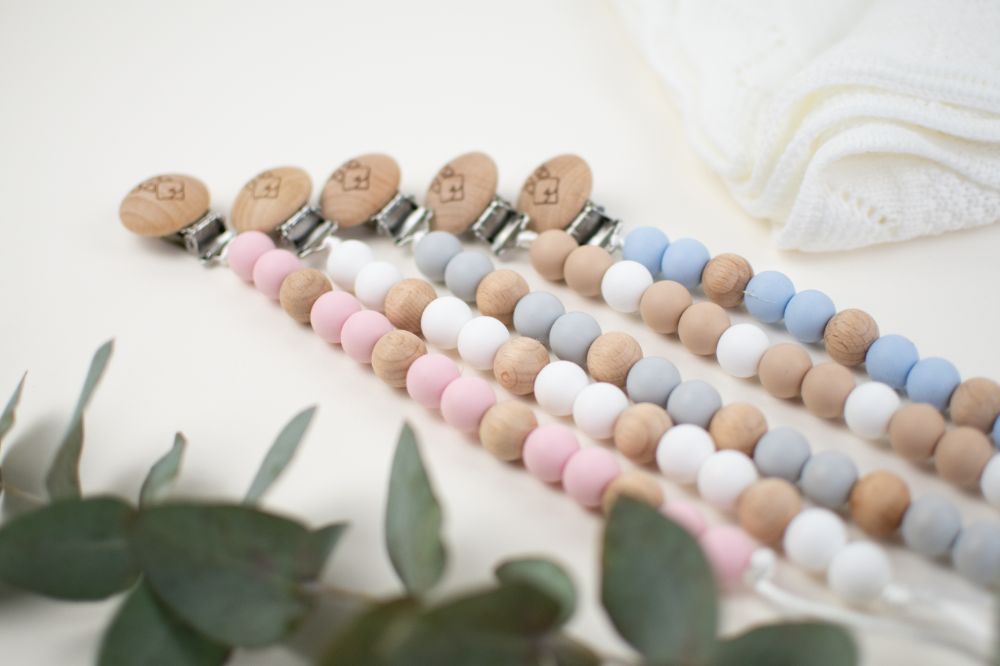 clip porta chupon con distintas texturas y figuras (silicon libre de bpa y madera tratada con aceite de resino) que favorecen a la integracion sensorial. Color rosa beige