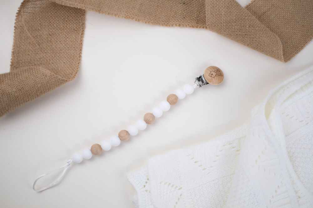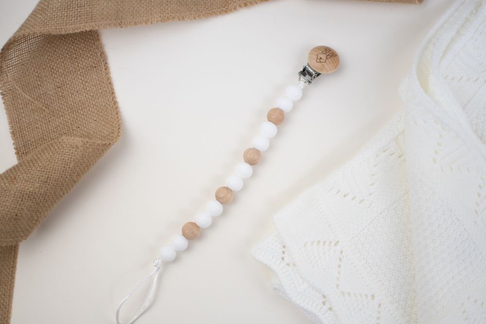 clip porta chupon con distintas texturas y figuras (silicon libre de bpa y madera tratada con aceite de resino) que favorecen a la integracion sensorial. Color rosa beige