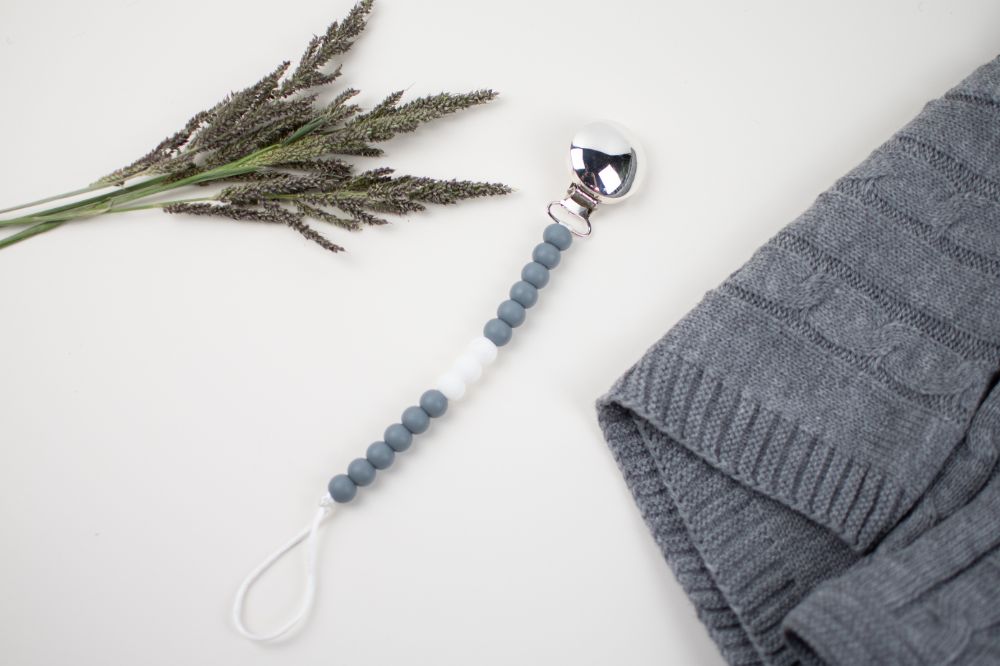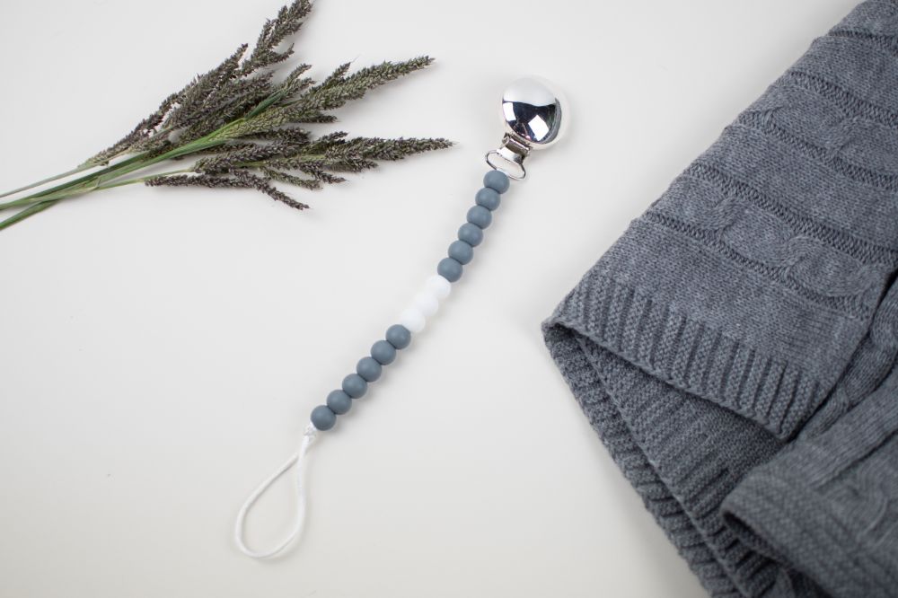 porta chupon personalizable de madera cubierto en plata ley 925 con strap de solicon libre de bpa que ayuda al desarrollo sensorial y denticion de tu bebe.