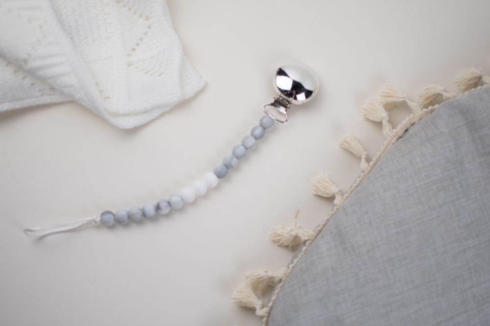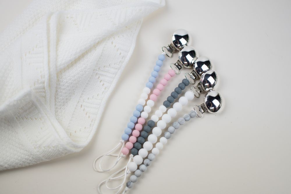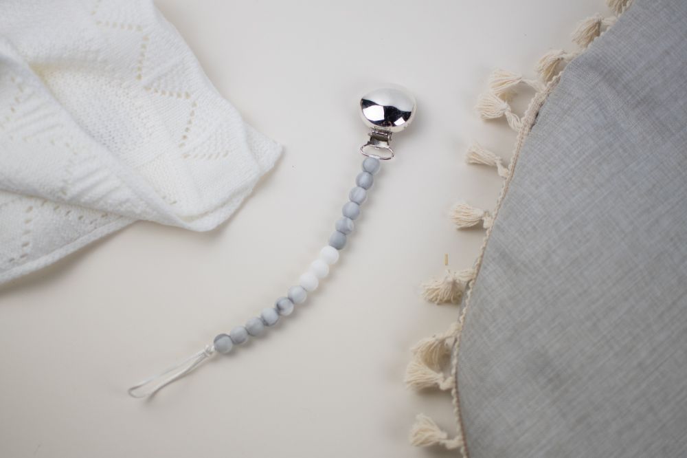 porta chupon personalizable de madera cubierto en plata ley 925 con strap de solicon libre de bpa que ayuda al desarrollo sensorial y denticion de tu bebe.
