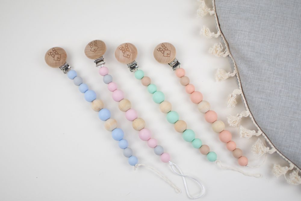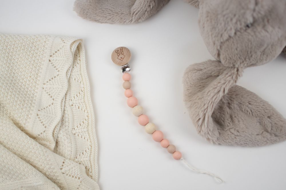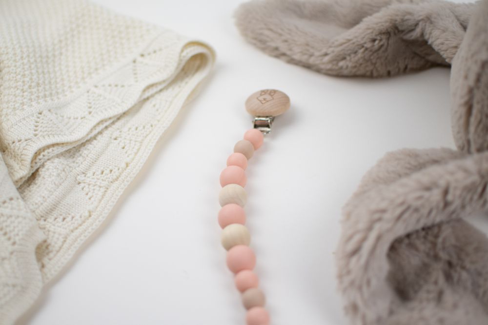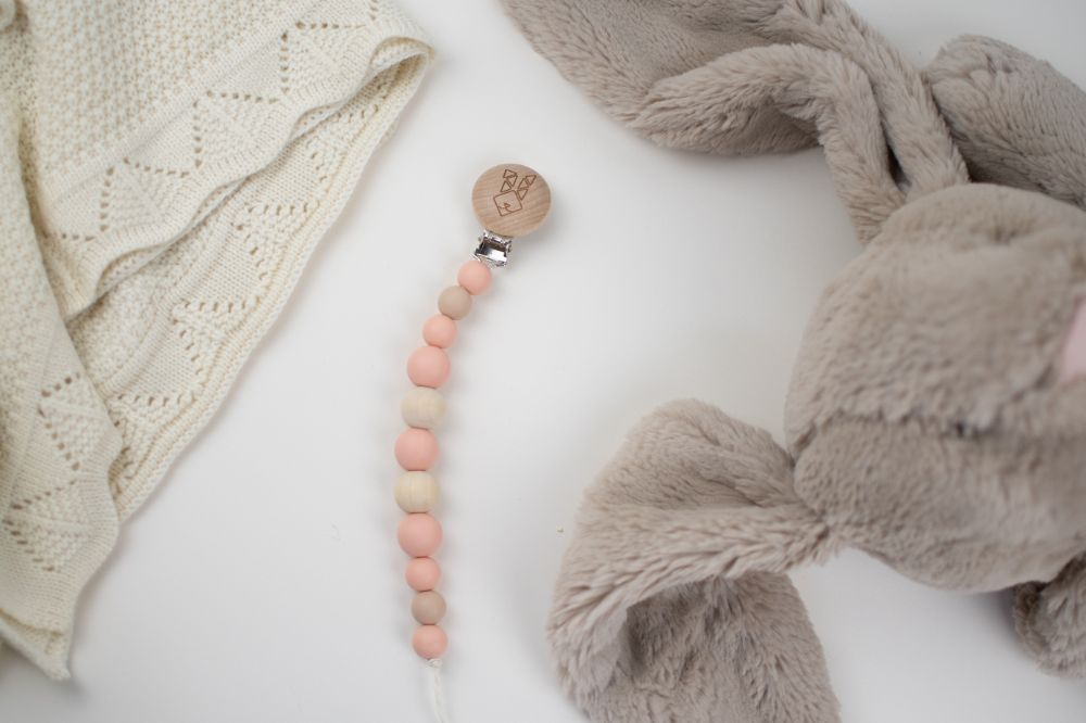 clip porta chupon con distintas texturas y figuras (silicon libre de bpa y madera tratada con aceite de resino) que favorecen a la integracion sensorial. Color rosa beige