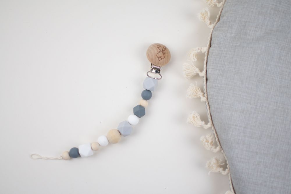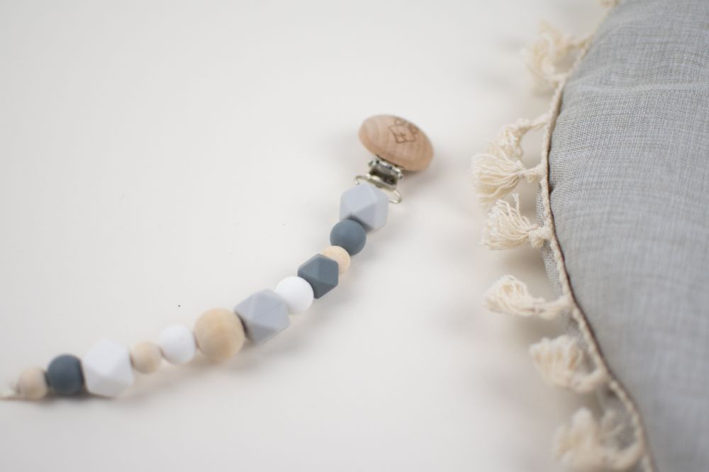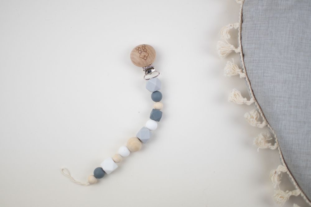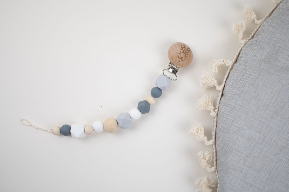 clip porta chupon con distintas texturas y figuras (silicon libre de bpa y madera tratada con aceite de resino) que favorecen a la integracion sensorial. Color rosa beige