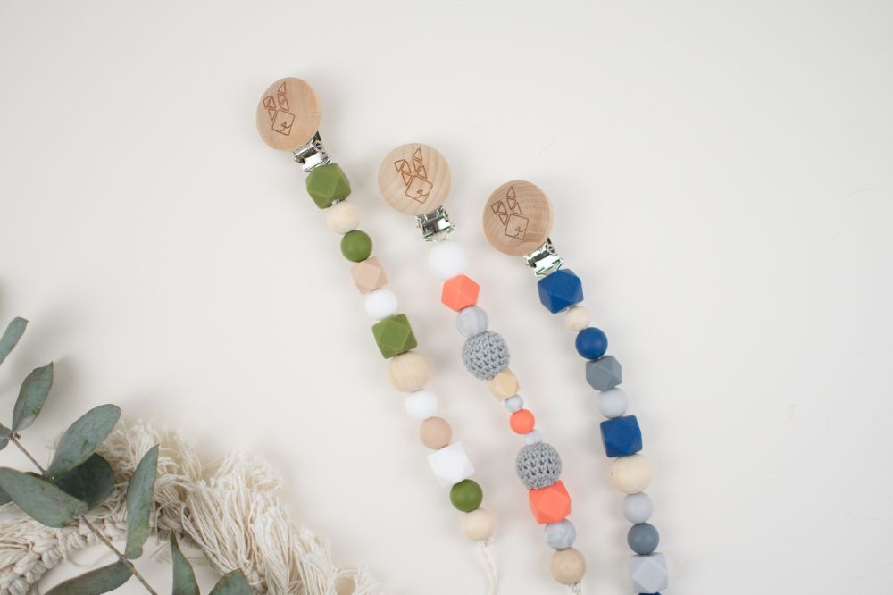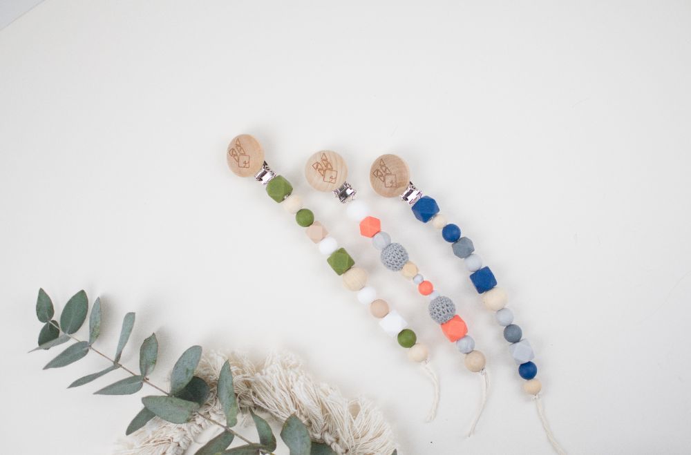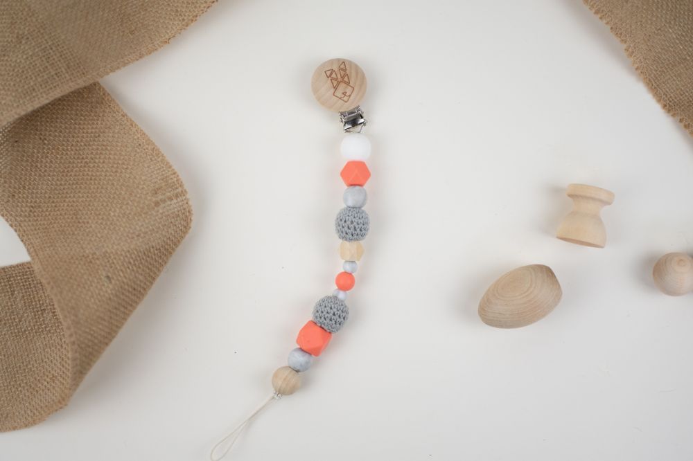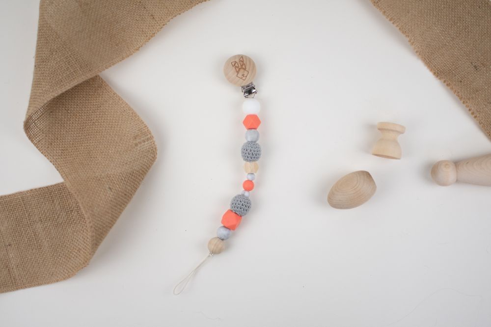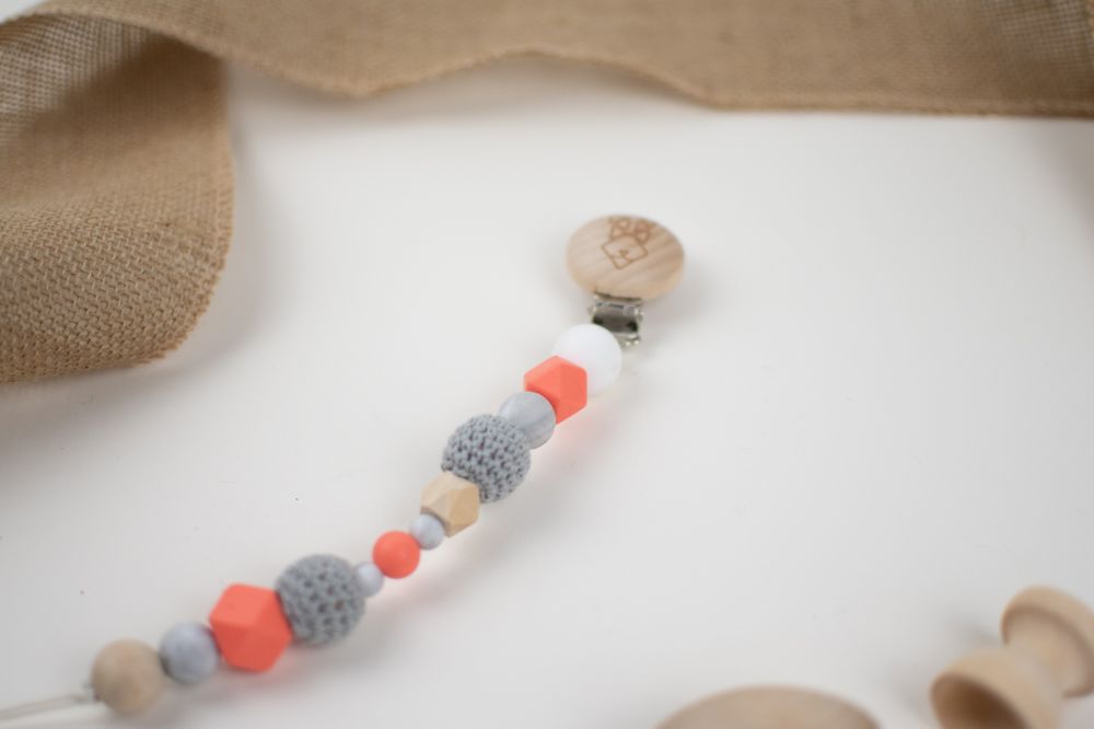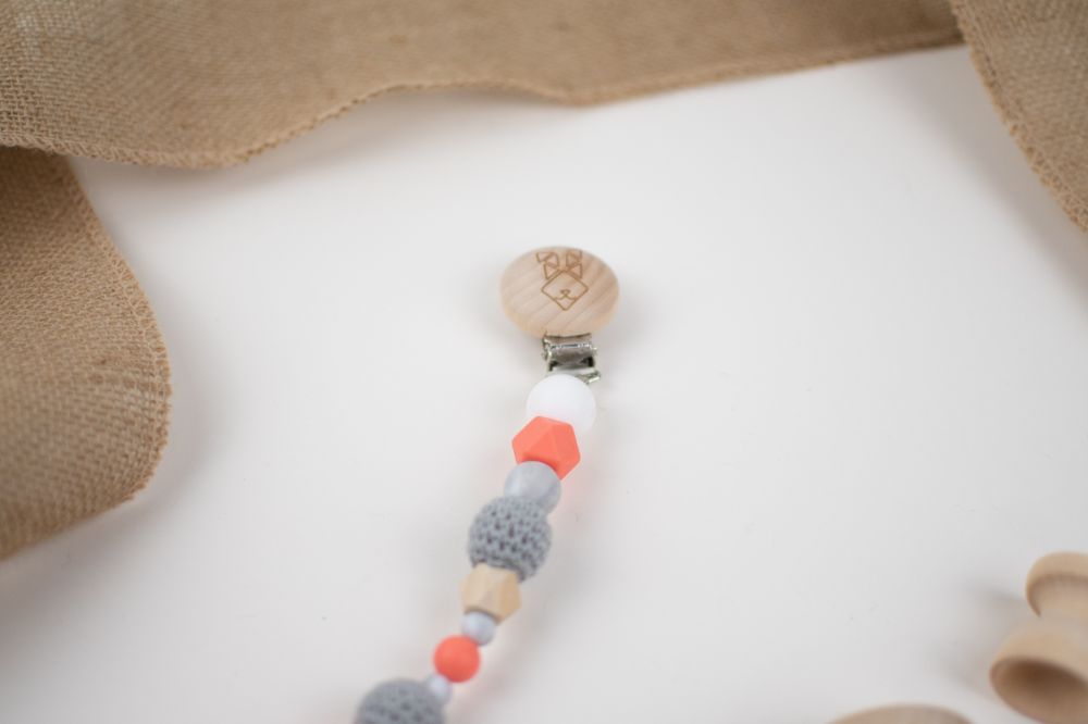 clip porta chupon con distintas texturas y figuras (silicon libre de bpa y madera tratada con aceite de resino) que favorecen a la integracion sensorial. Color rosa beige