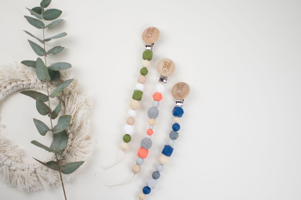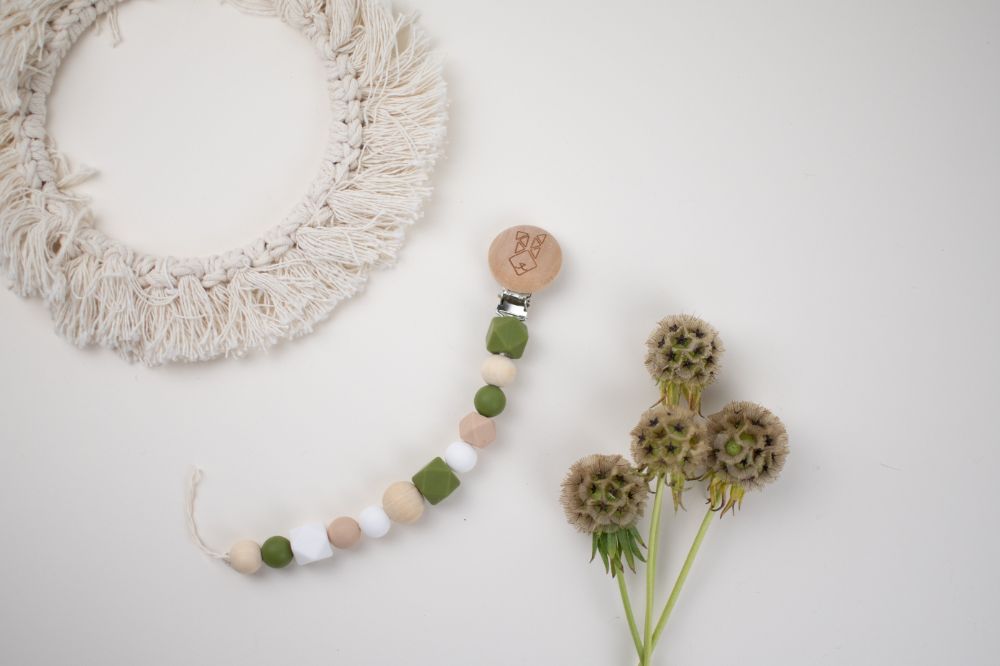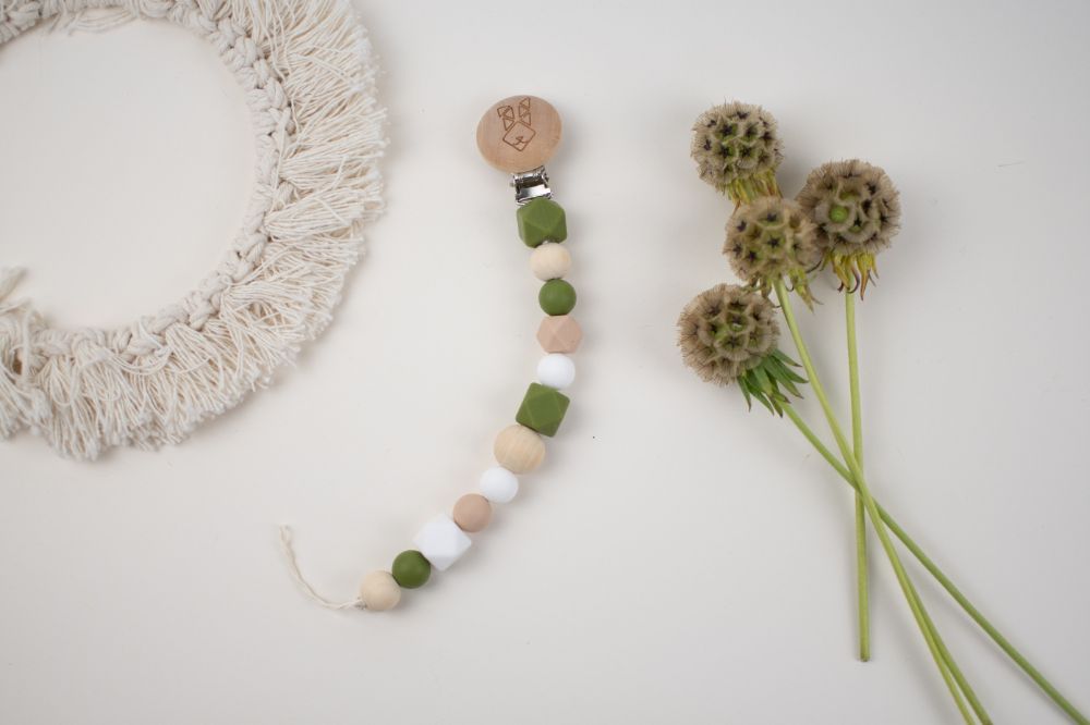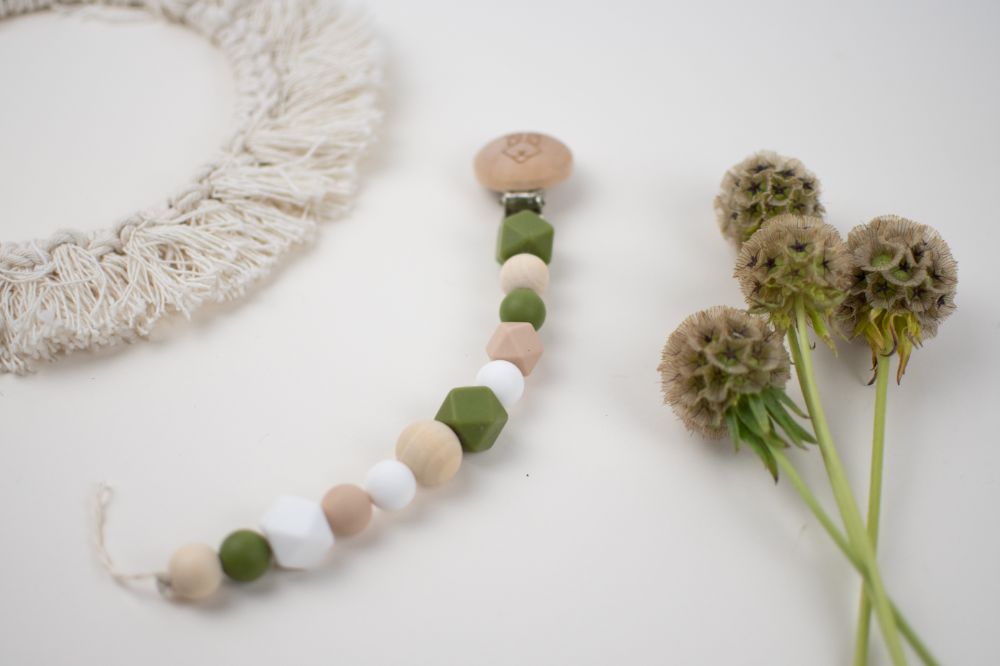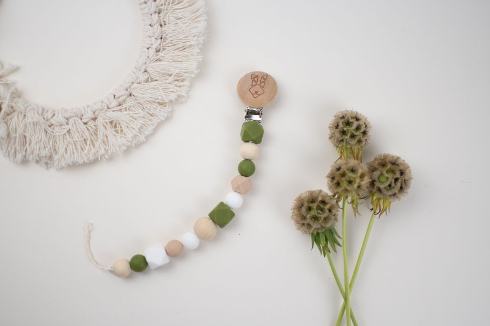 clip porta chupon con distintas texturas y figuras (silicon libre de bpa y madera tratada con aceite de resino) que favorecen a la integracion sensorial. Color rosa beige