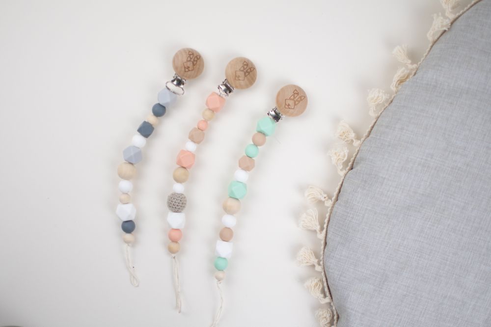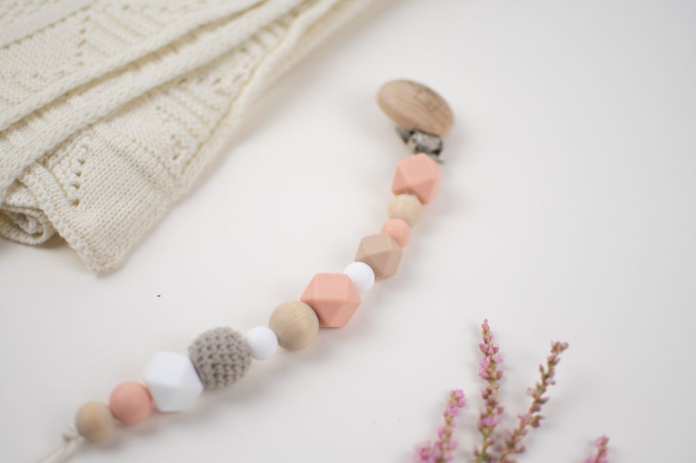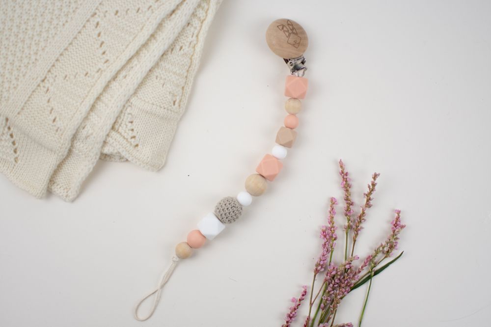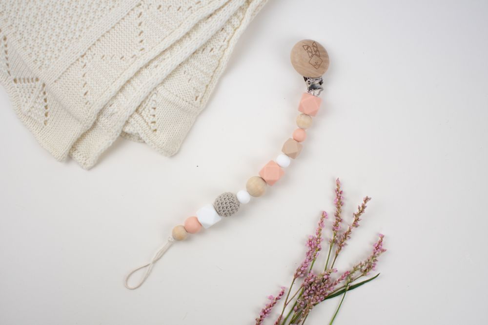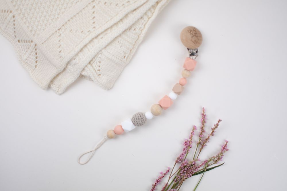 clip porta chupon con distintas texturas y figuras (silicon libre de bpa y madera tratada con aceite de resino) que favorecen a la integracion sensorial. Color rosa beige