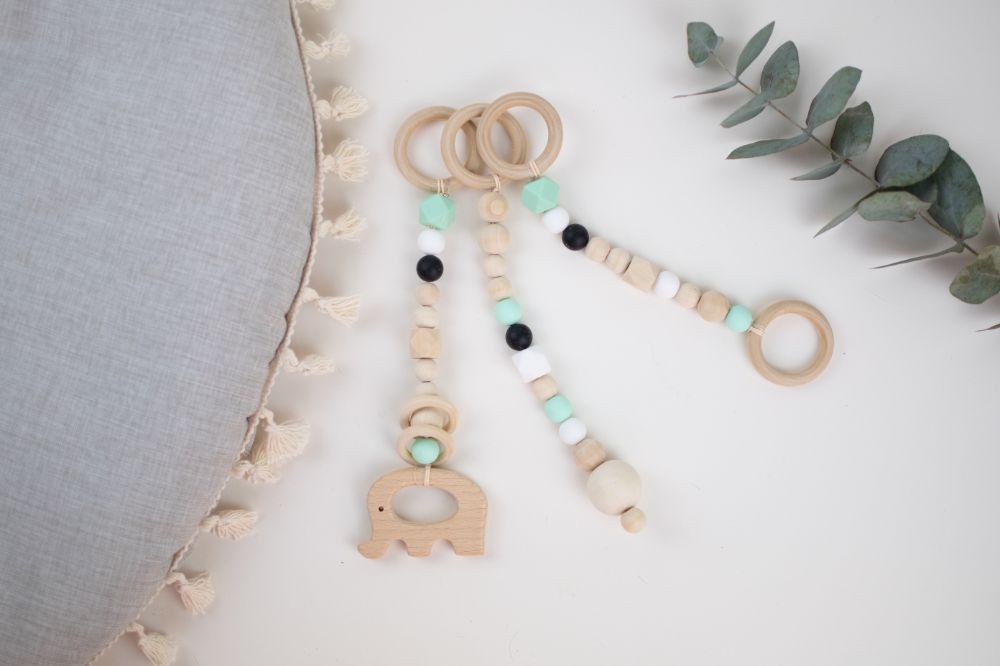 set de colgantes para gimnasio, cuna, huevito o carriola. juguete y mordedera con distintas texturas y figuras (silicon libre de bpa y madera tratada con aceite de resino) que favorecen a la integracion sensorial, a la coordinacion ojo mano mediante el juego y ademas ayudan a tus chiquitines para que el proceso de denticion sea mucho mas llevadero y menos doloroso.